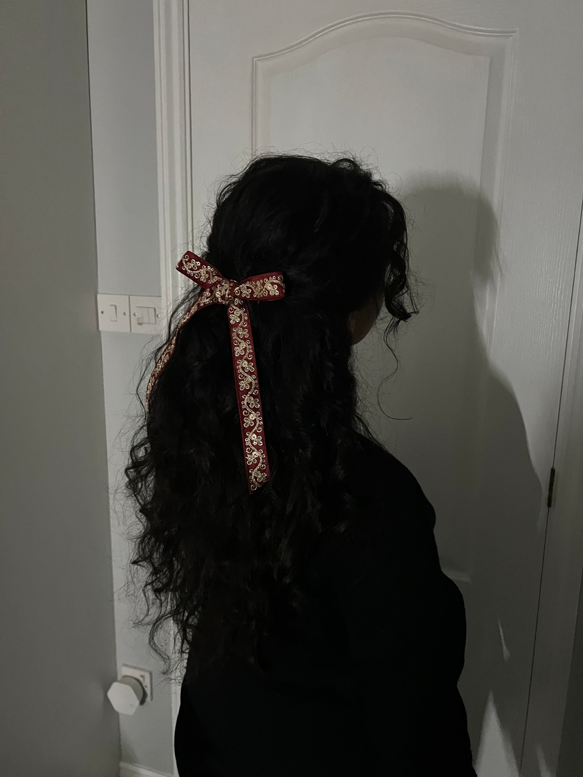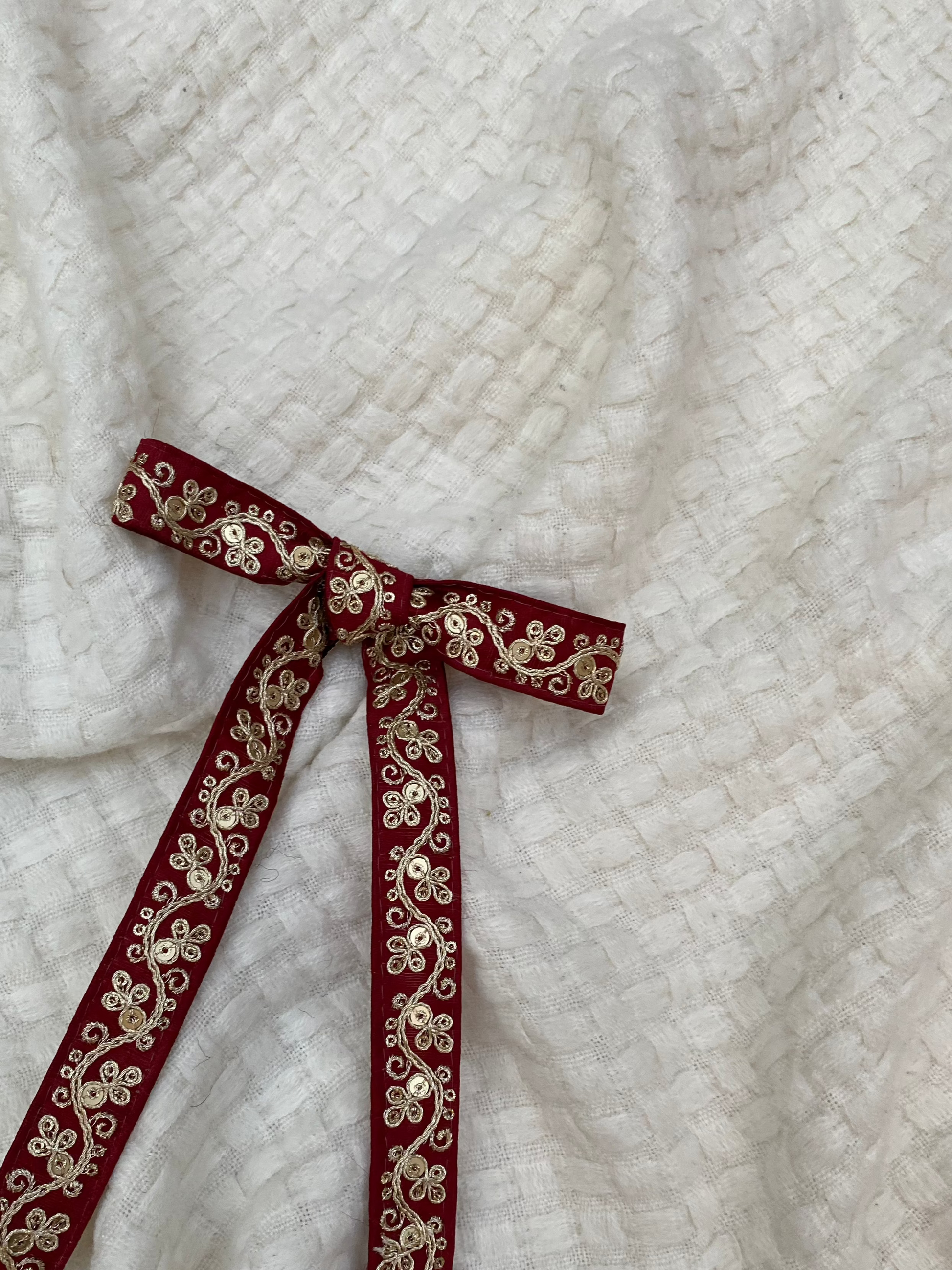 Our handcrafted Indian embroidery bow is a true work of art. Each piece is meticulously designed, featuring elegant long tails. A standout accessory, this bow is a unique addition to the Gondalian Bow collection.