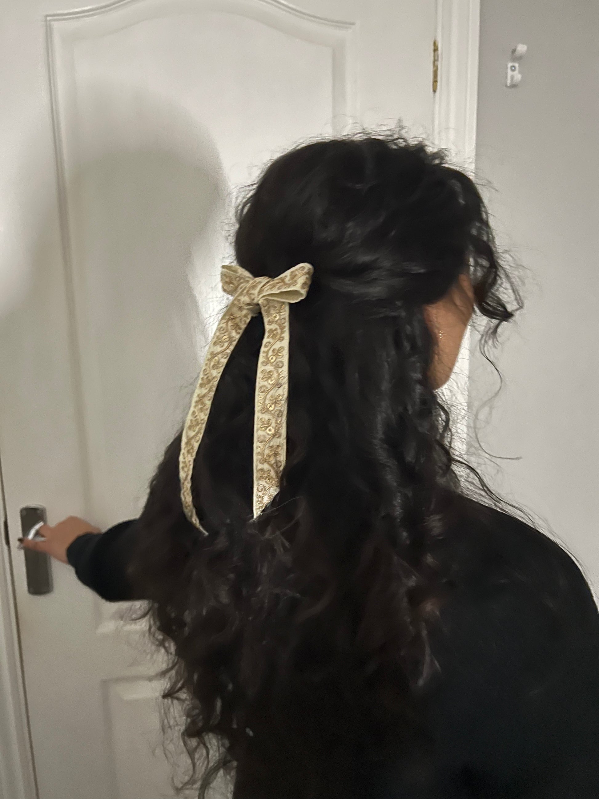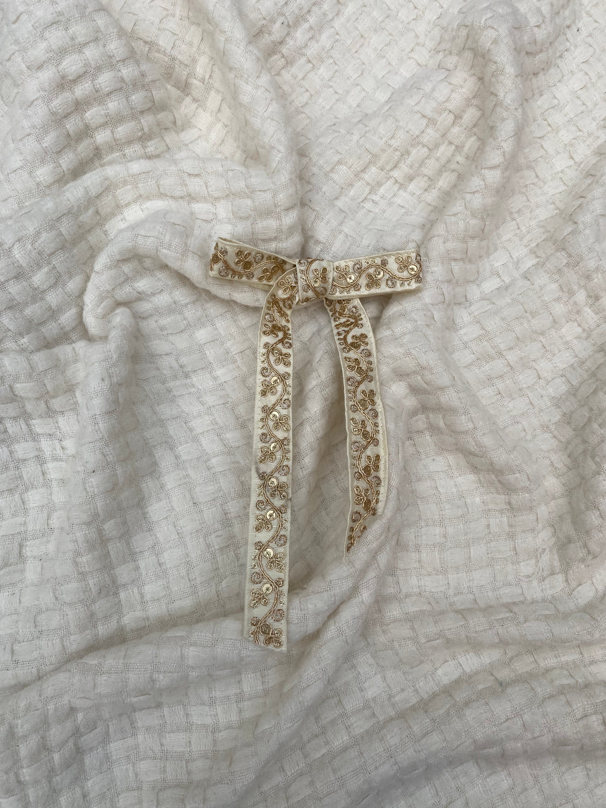 Our handcrafted Indian embroidery bow is a true work of art. Each piece is meticulously designed, featuring elegant long tails. A standout accessory, this bow is a unique addition to the Gondalian Bow collection.