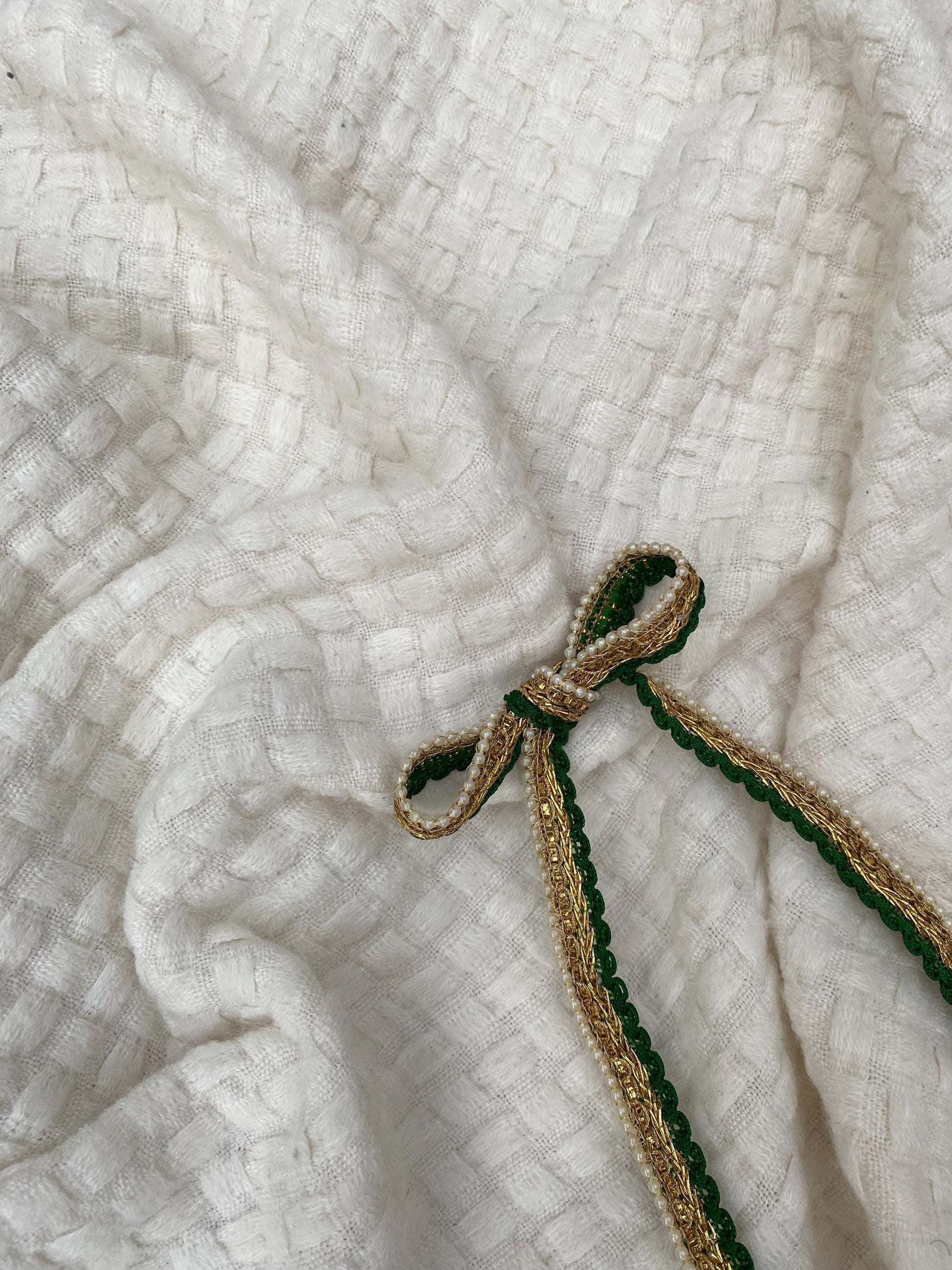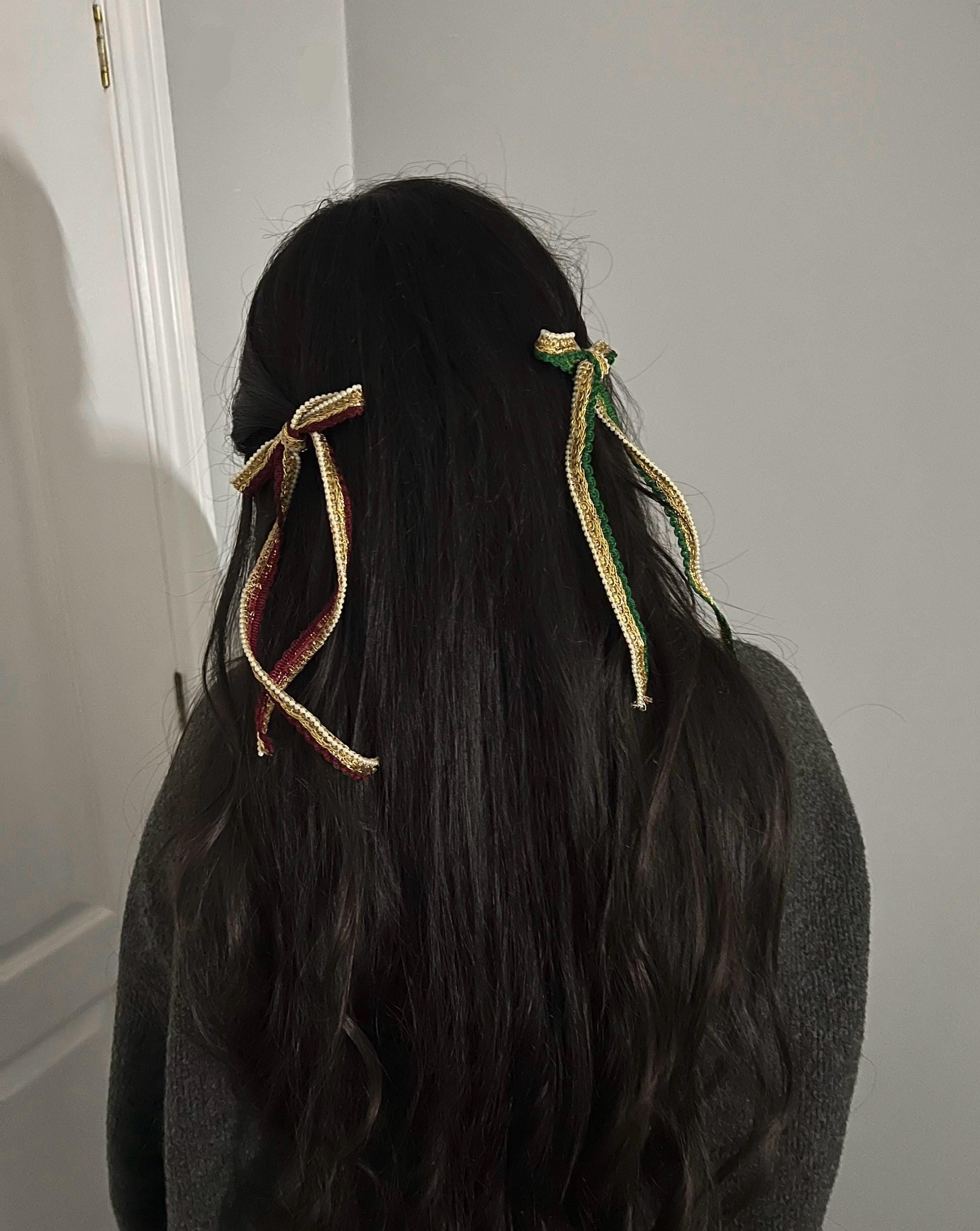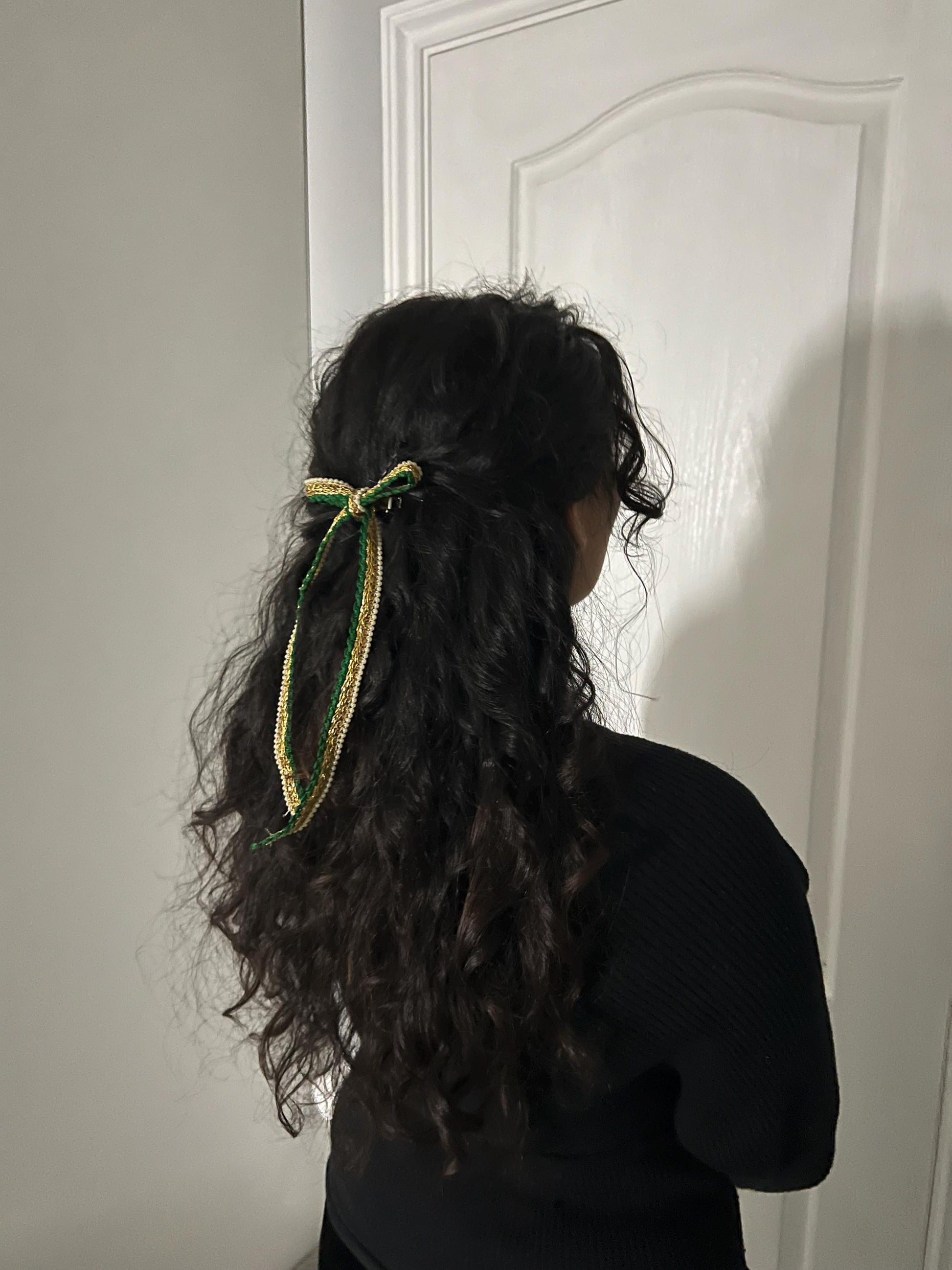 Our handcrafted Indian embroidery bow is a true work of art. Each piece is meticulously designed, featuring elegant long tails. A standout accessory, this bow is a unique addition to the Gondalian Bow collection.
